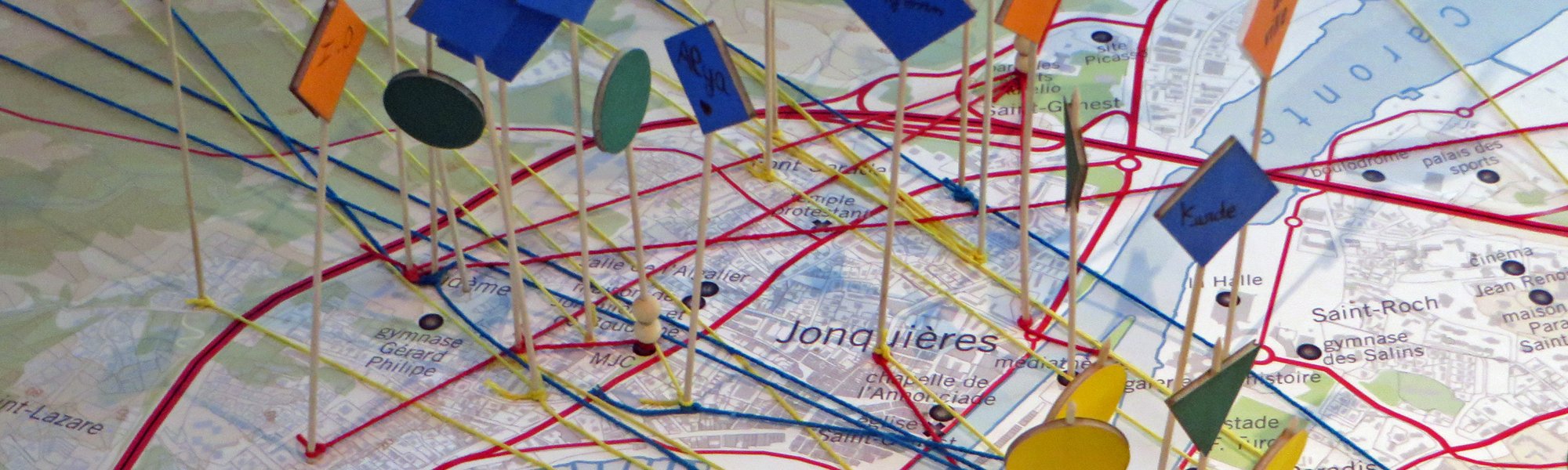Ensuite, il enregistre ses réponses en les matérialisant sur la carte par des fanions et des fils tendus dont les couleurs correspondent aux moyens de déplacement envisagés.