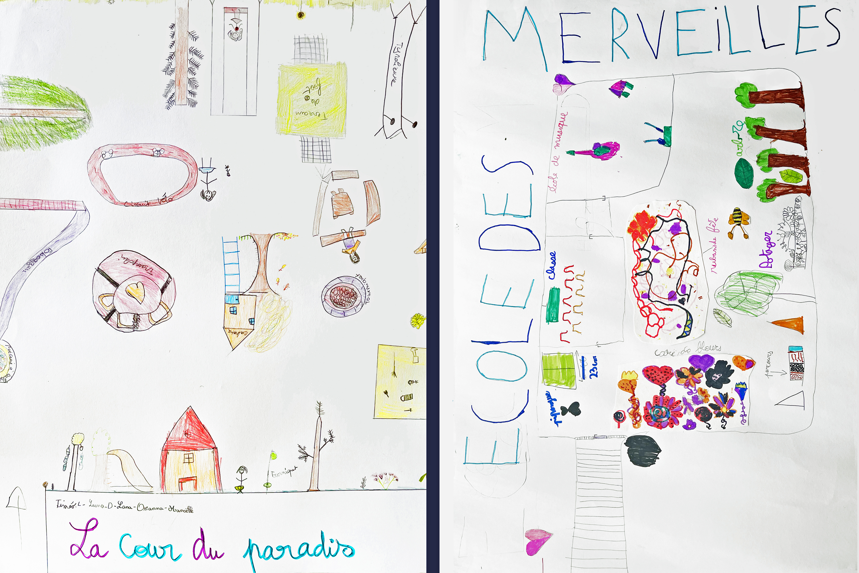 Pendant la récréation, les intervenants ont observé les élèves. Malgré nos efforts quotidiens, les constats étaient éloquents : la cour restait genrée. Les jeux de ballon monopolisent l’espace central, les filles occupent les marges ou se retirent dans des zones calmes. Ces observations ont nourri la seconde partie du projet : dessiner la cour de ses rêves.