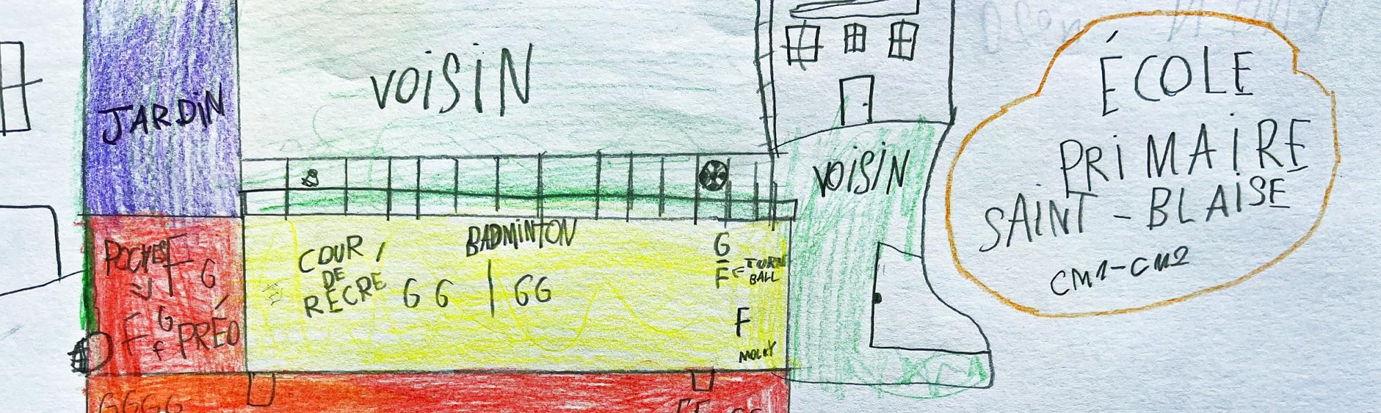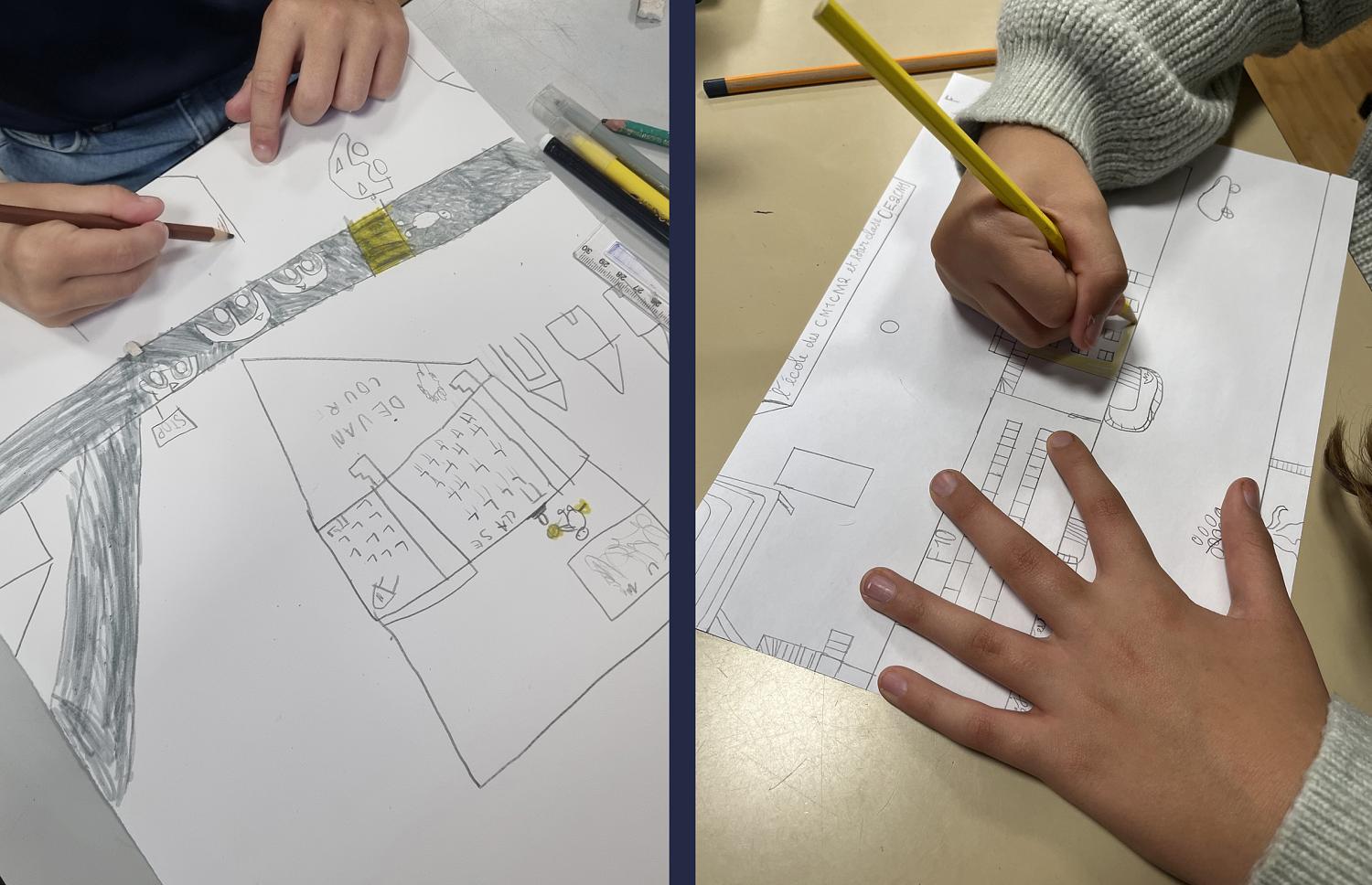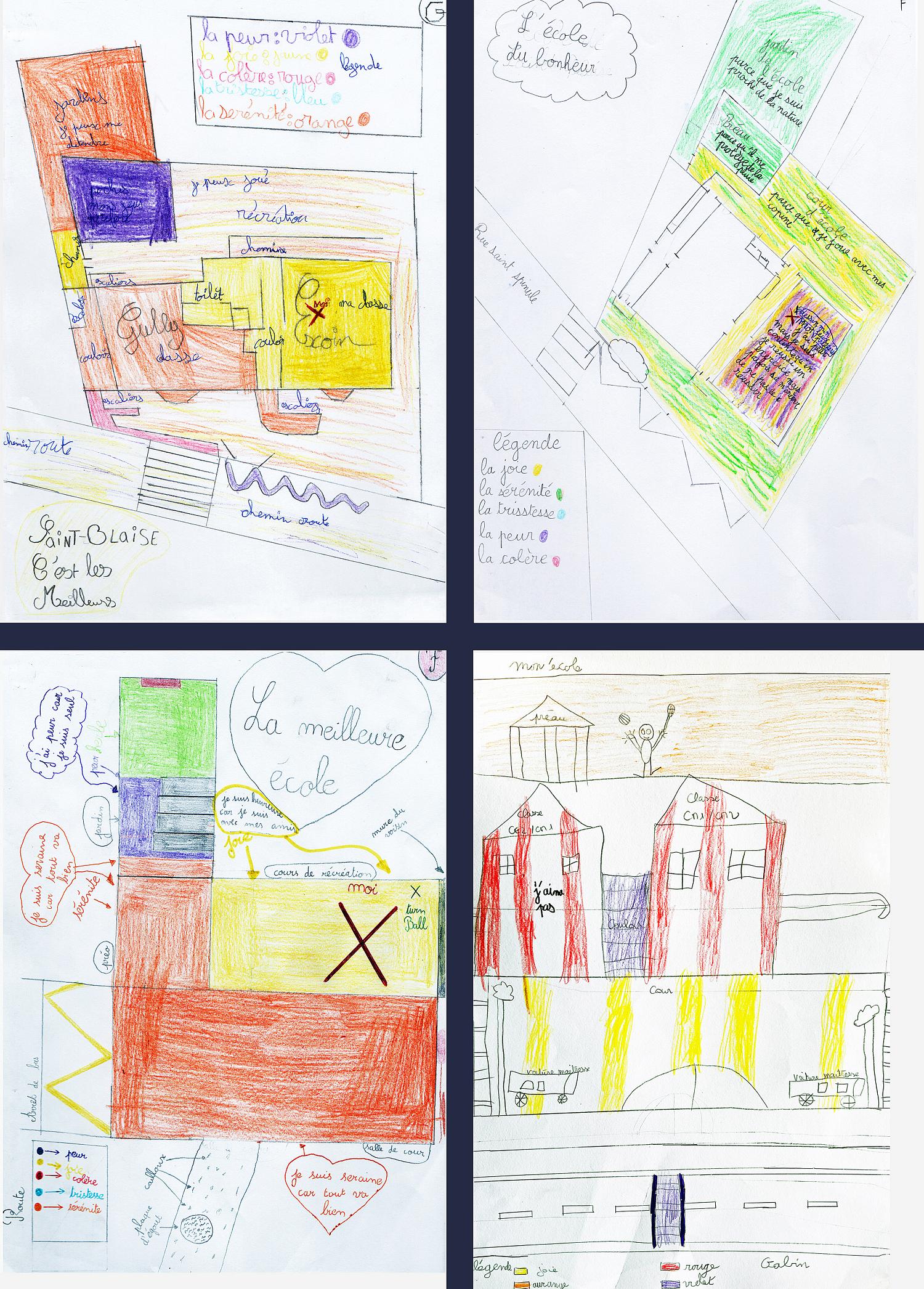 L’atelier s’est déroulé en deux temps. La première partie, menée par Nepthys Zwer, consistait à dessiner la carte des émotions. David Goeury travaillait en parallèle avec la classe de CE1/CE2. Après une courte introduction à la vue zénithale (si évidente pour les CM2, plus difficile à conceptualiser pour les plus jeunes), les élèves ont élaboré une légende émotionnelle (inspirée bien malgré nous par le film Vice Versa. Chaque couleur correspondant à une émotion : joie, sérénité, peur, colère… Les enfants ont représenté leurs ressentis face aux différents espaces de leur école.