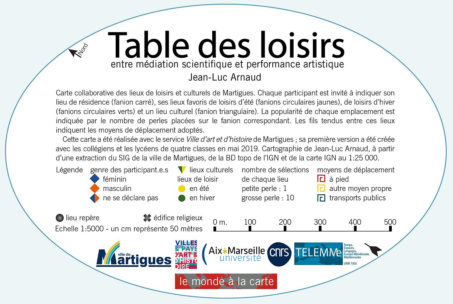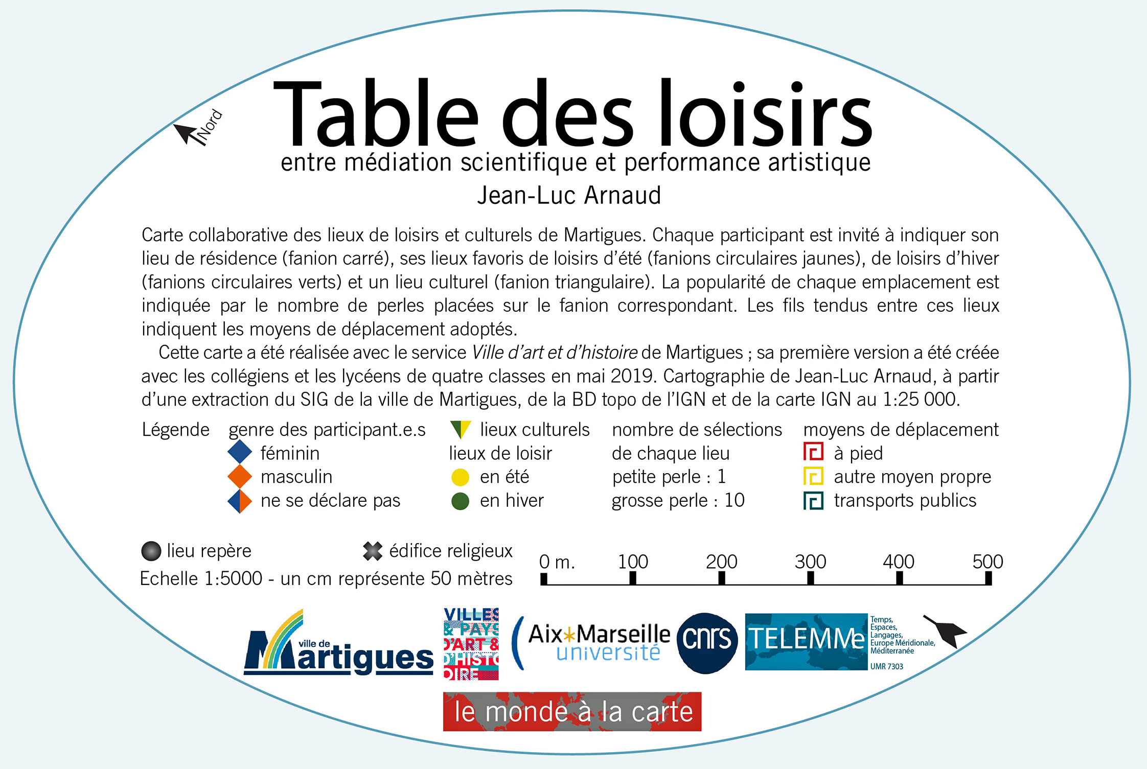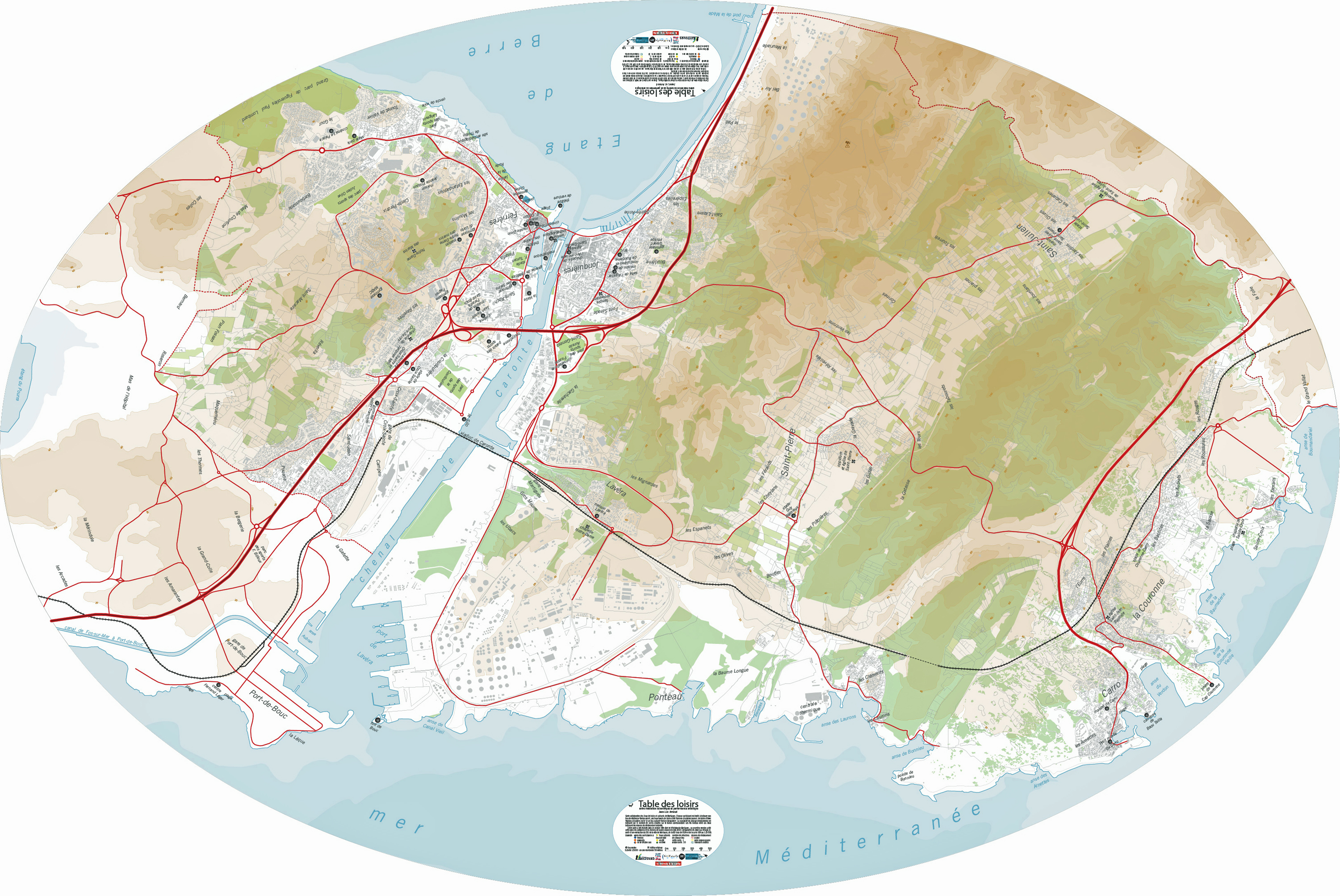 La carte de base figure la topographie du territoire municipal de Martigues et une partie de la commune voisine de Port-de-Bouc, soit une petite portion de la surface terrestre. Sa forme ovale – semblable à celle d’un planisphère – rappelle que le monde n’est pas seulement celui de la définition des géographes mais qu’il peut être déterminé par les pratiques de chacun dans des espaces parfois restreints.