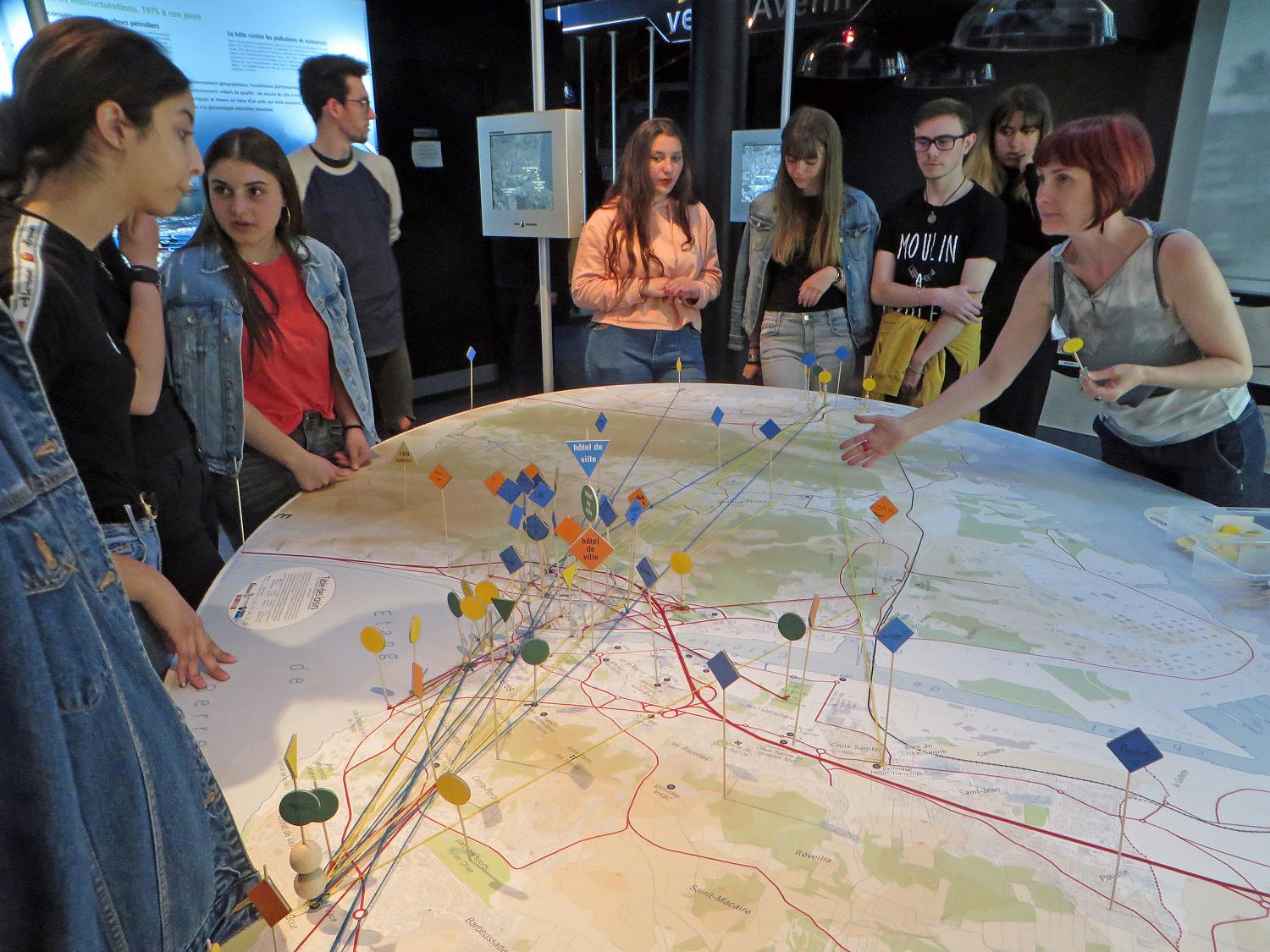 La figuration des lieux culturels et de loisirs fréquentés par les lycéens se propose de montrer que, suivant leur genre, leur lieu de résidence et la météo, le monde individuel de chacun s’inscrit de manière particulière dans l’espace local. Chaque groupe d’élève – une classe – construit sa carte sur un fond débarrassé des interventions précédentes. Ainsi, l’addition des contributions permet de distinguer les lieux les plus plébiscités par chaque groupe de niveau.