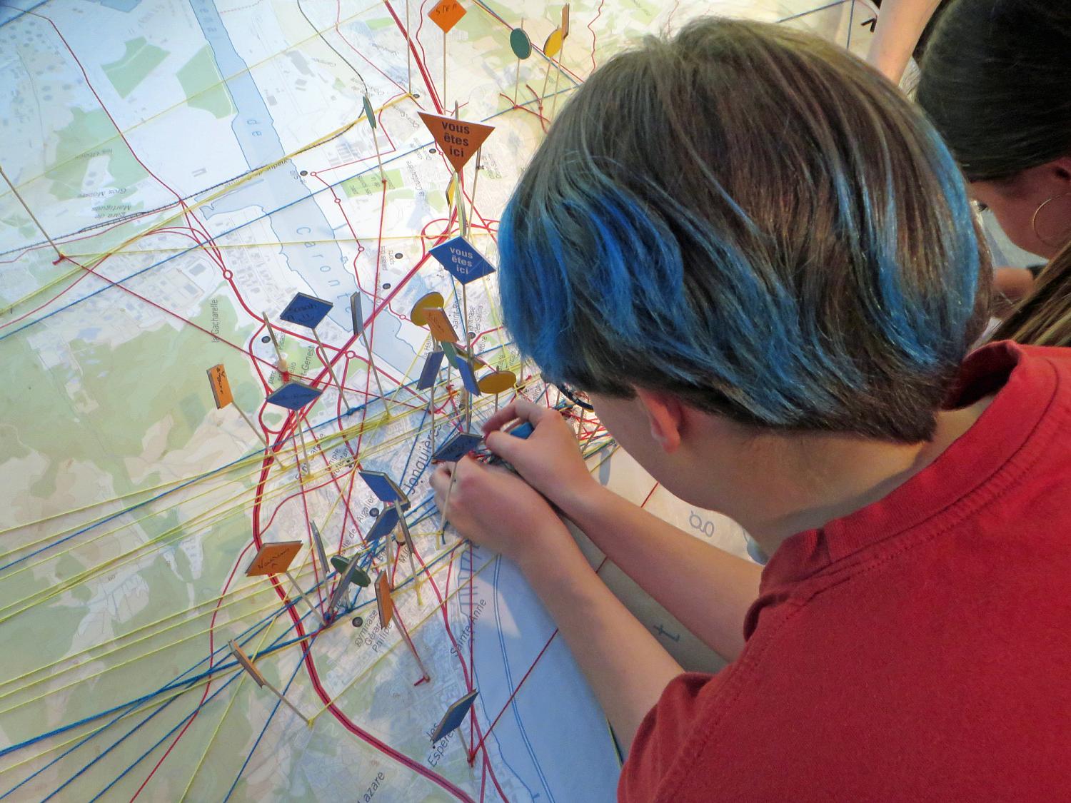 Ensuite, il enregistre ses réponses en les matérialisant sur la carte par des fanions et des fils tendus dont les couleurs correspondent aux moyens de déplacement envisagés.