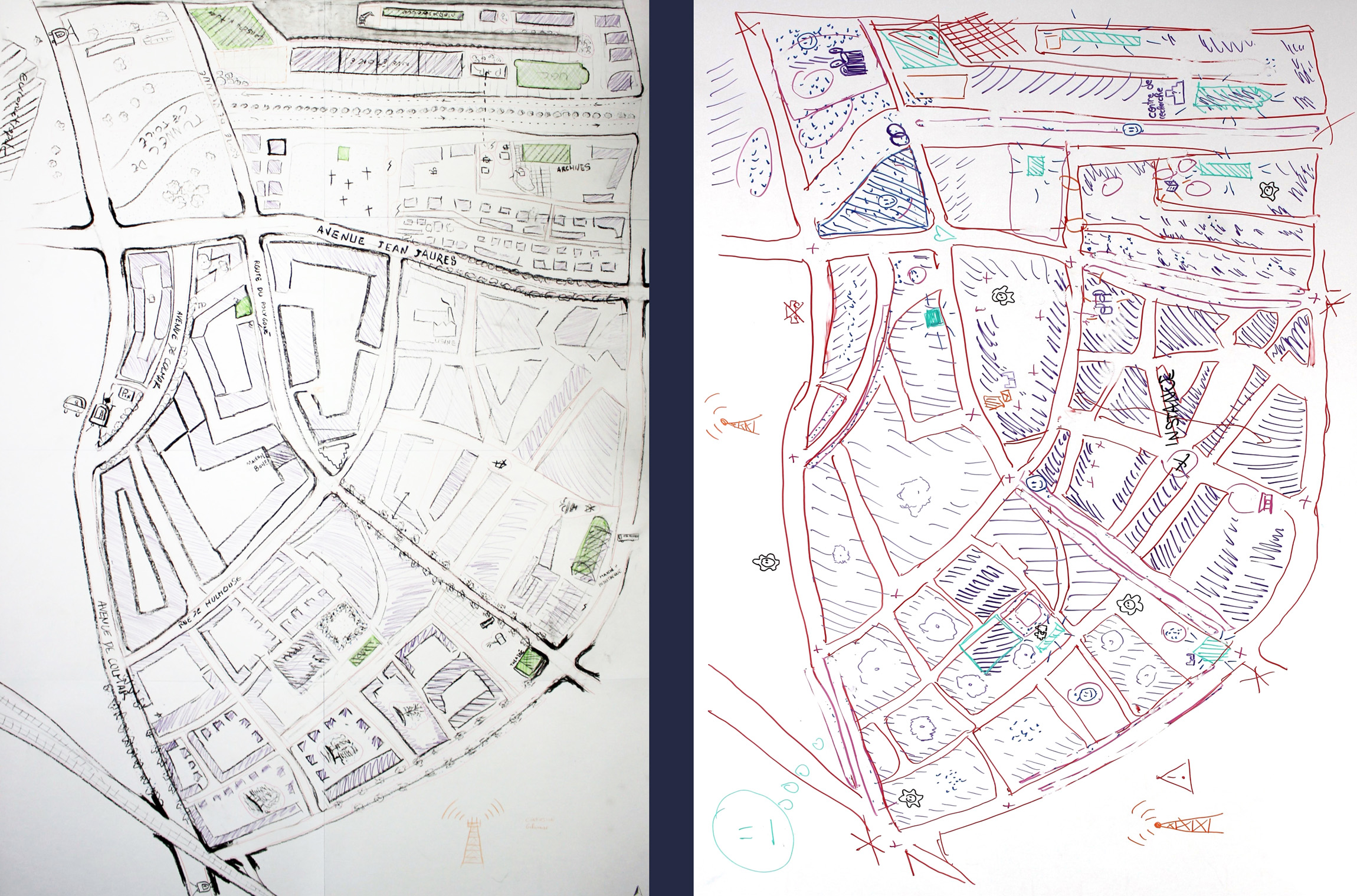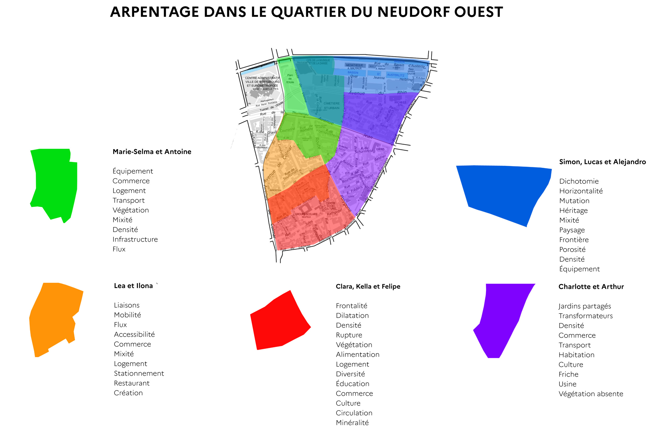Pour imaginer notre propre jeu de rôle, il a donc fallu aller à la rencontre de notre terrain de jeu. Les étudiantes se sont rendues dans le quartier du Neudorf pour effectuer des relevés des infrastructures présentes et des interactions entre les éléments qui les composent. De leur analyse du territoire a été mis en place un atelier de cartographie collective qui a permis de mettre en perspective des enjeux inhérents au quartier.