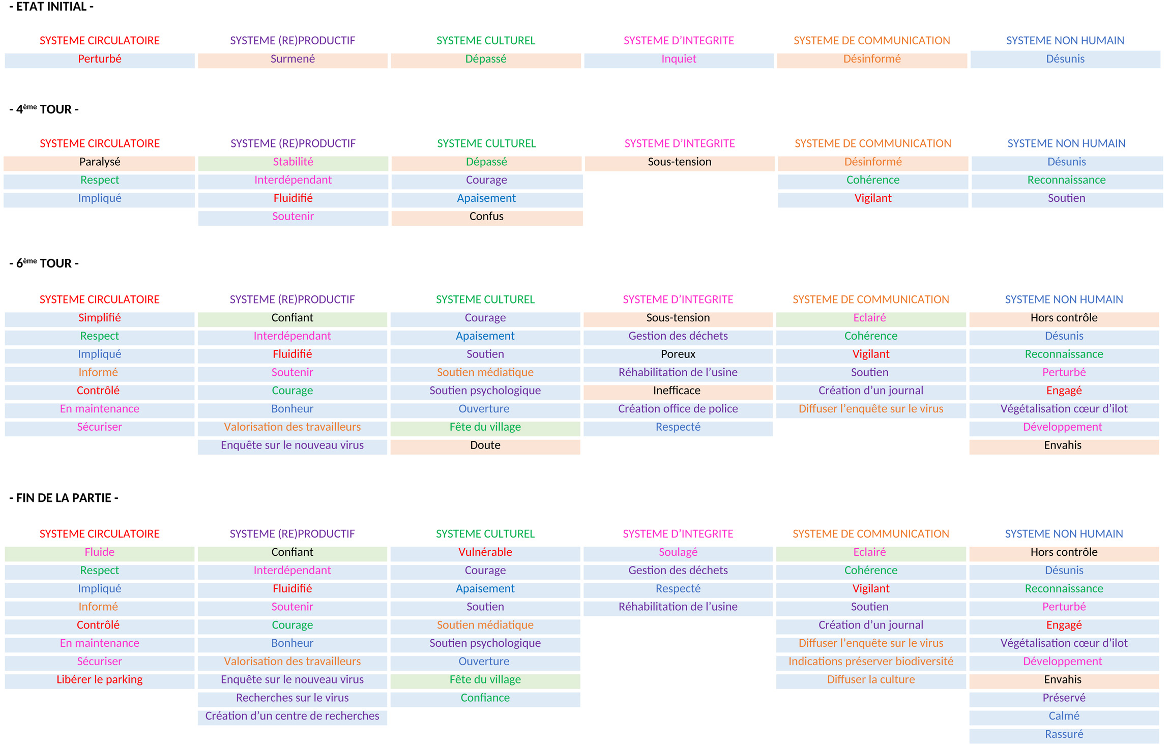 Mois 3 : Nous voyons les conséquences d’avoir trop concentré nos forces en un seul Système. Le Système de l’Intégrité se trouve sous tension, ce qui rend le Système Culturel confus et paralyse le Système Circulatoire. Avec un grand effort collectif des autres Systèmes, nous réussissons au moins à rendre la circulation plus fluide, ce qui limite les dégâts.