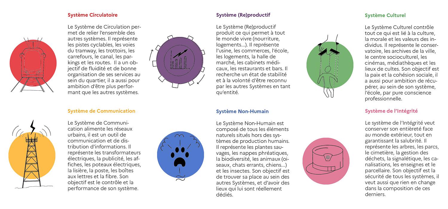 La création des différents systèmes du quartier a pu se mettre en place suite à notre cartographie. Nous avons identifié les instances les plus visibles et les plus décisives dans le territoire pour faire une adaptation entre le jeu After the Maestro et le nôtre. À titre d’exemple, il a été souligné que le quartier était un lieu de passage avec des grands axes pour se déplacer rapidement. Le système sanguin de Tom K Kemp est devenu pour nous de Système de la Circulation. Au final, 6 systèmes ont été définis : circulatoire, (re)production, non-humain, intégrité, culturel et communication.